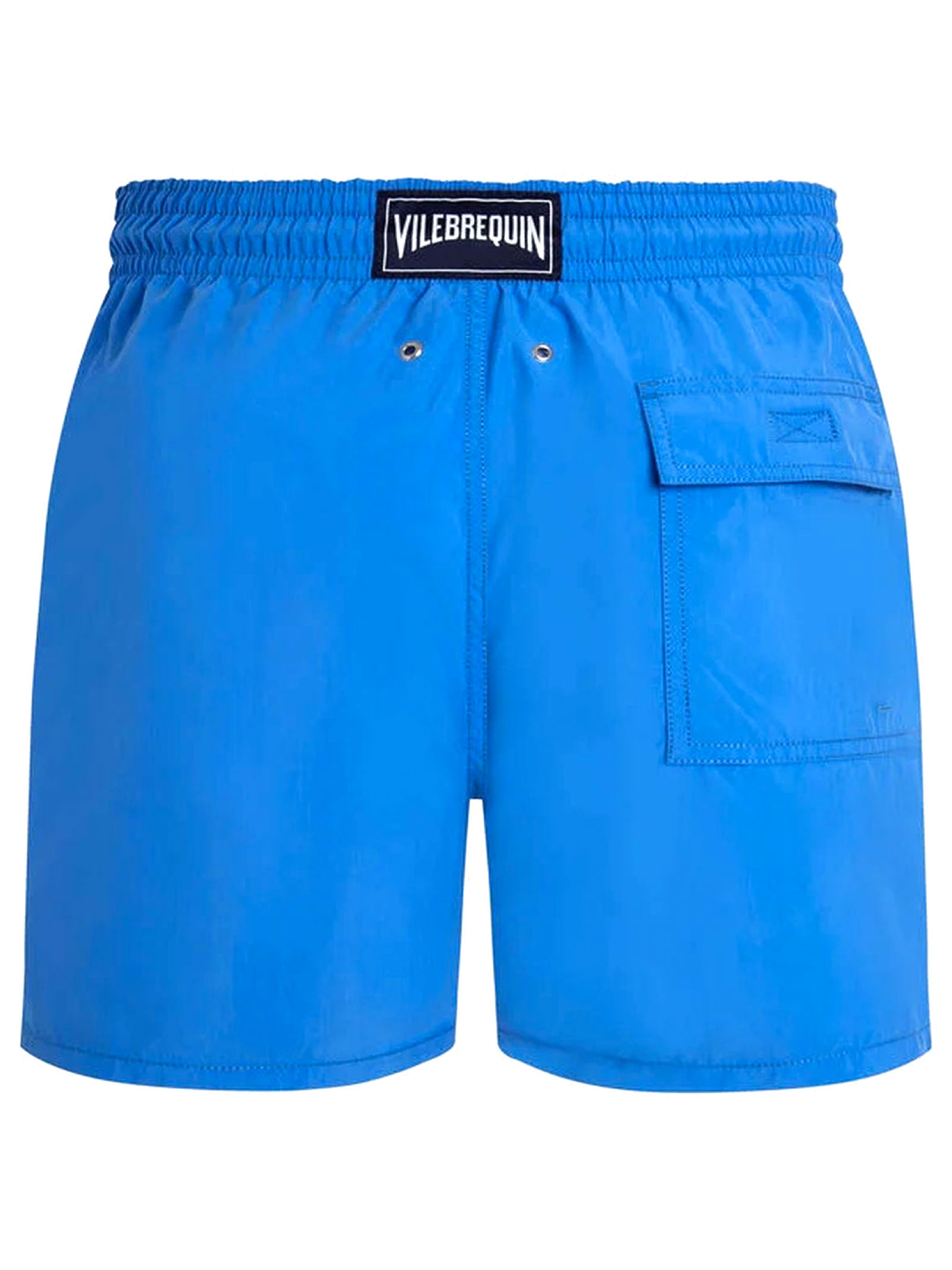 Costume da bagno con girovita elasticizzato dotato di coulisse con estremità in zamak e incisione Vilebrequin, Tasche laterali, Taschino posteriore cucito a mano per una perfetta continuità visiva con la stampa del costume da bagno, Due occhielli che consentono all'acqua di defluire per ridurre l'effetto "palloncino" quando si esce dall'acqua