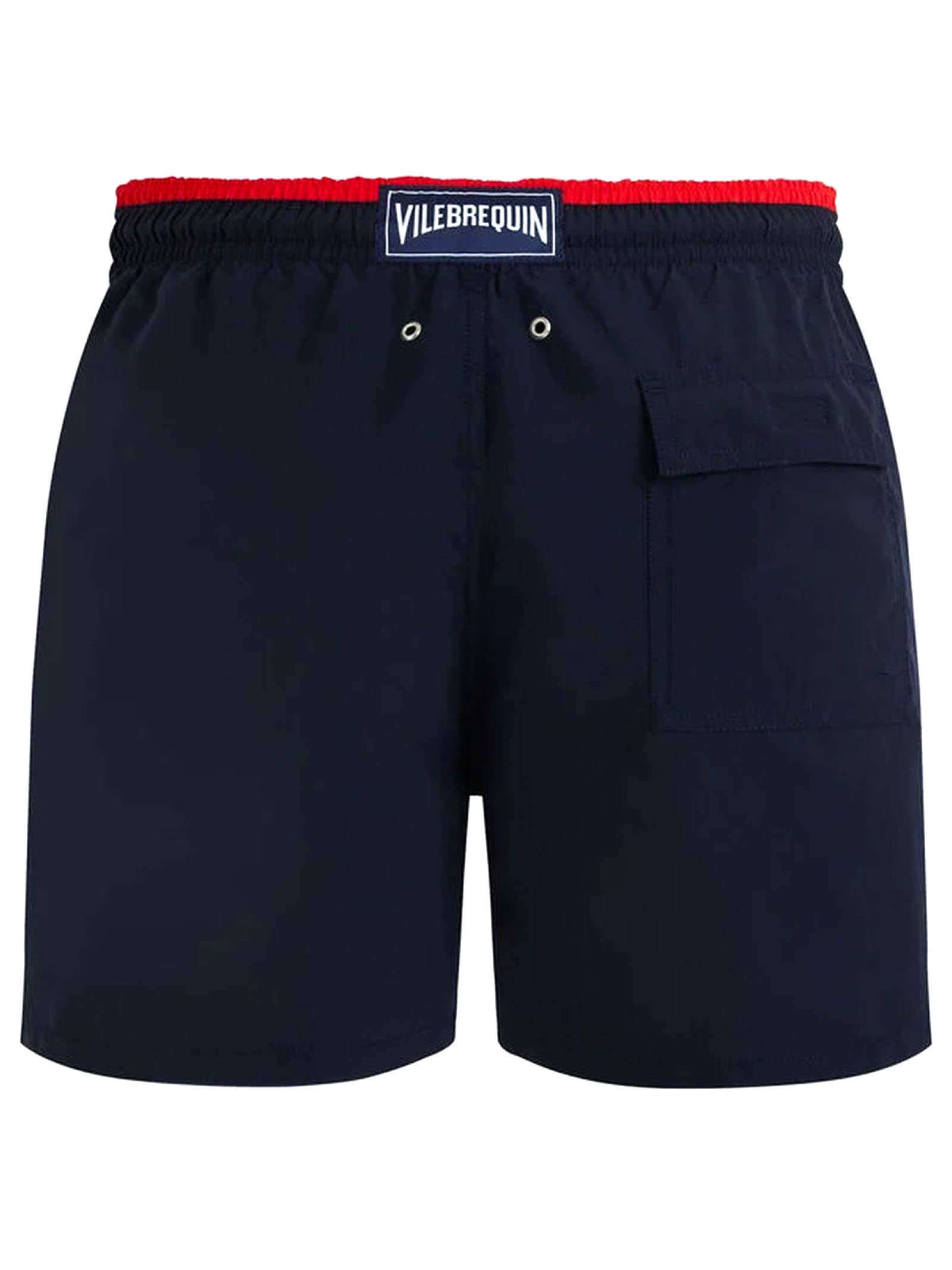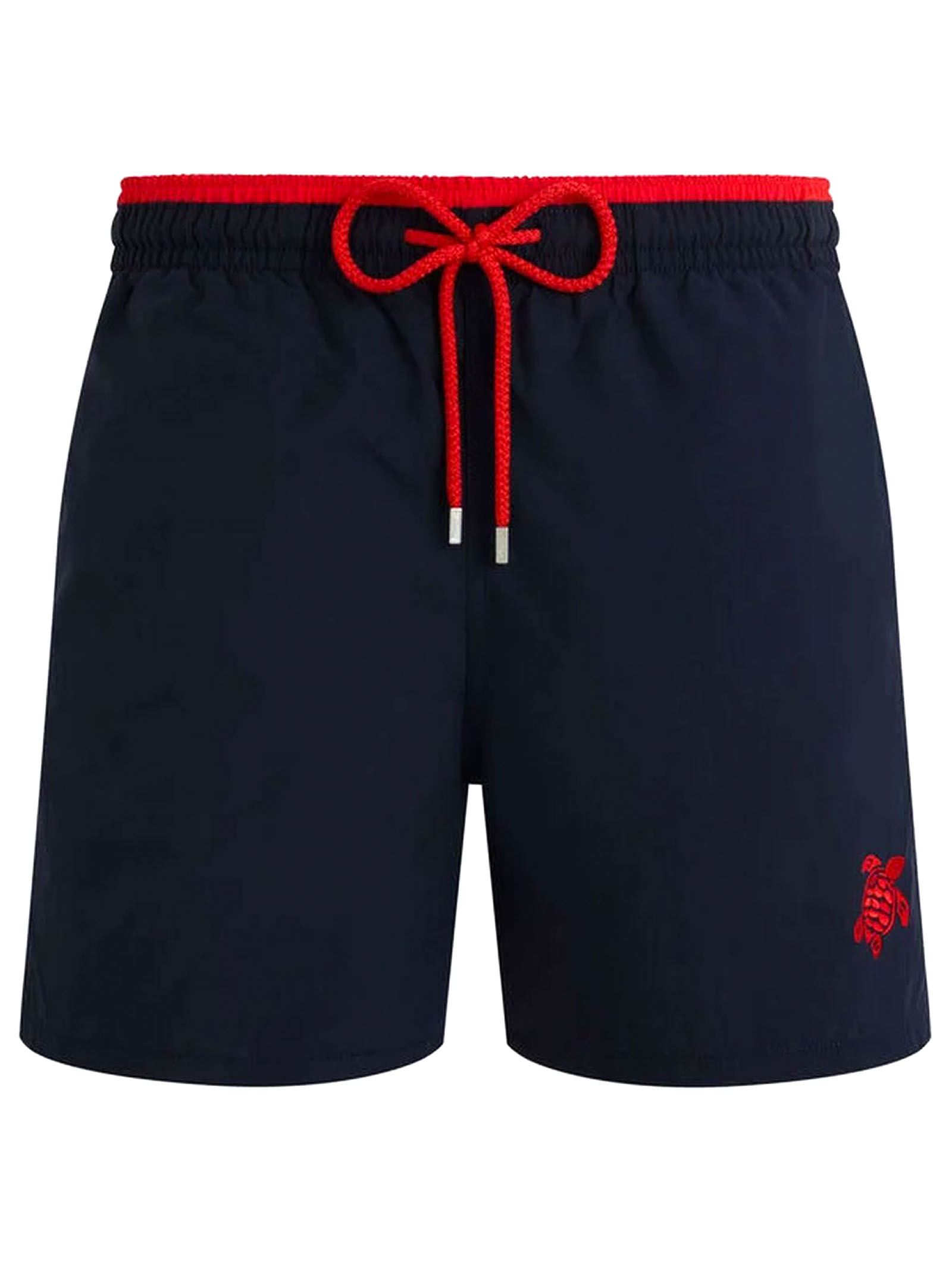 Pantaloncini mare da a due tonalità con colore a contrasto all'interno del girovita e 15 cm all'esterno, Girovita elasticizzato e coulisse con estremità in Zamak, Due tasche laterali, un taschino posteriore con chiusura in velcro e due occhielli sul retro, Tartaruga ricamata a contrasto sul fondo della gamba sinistra