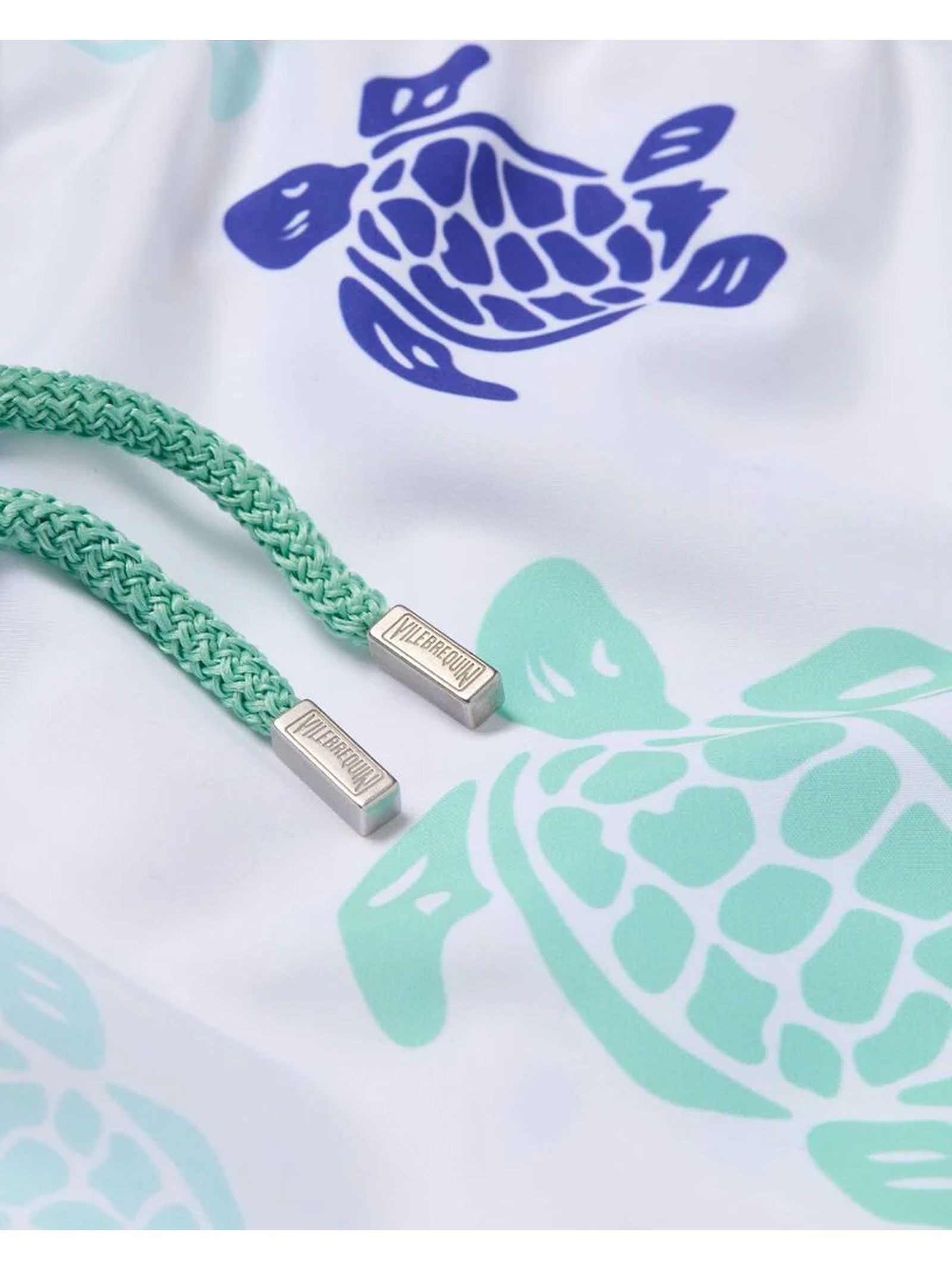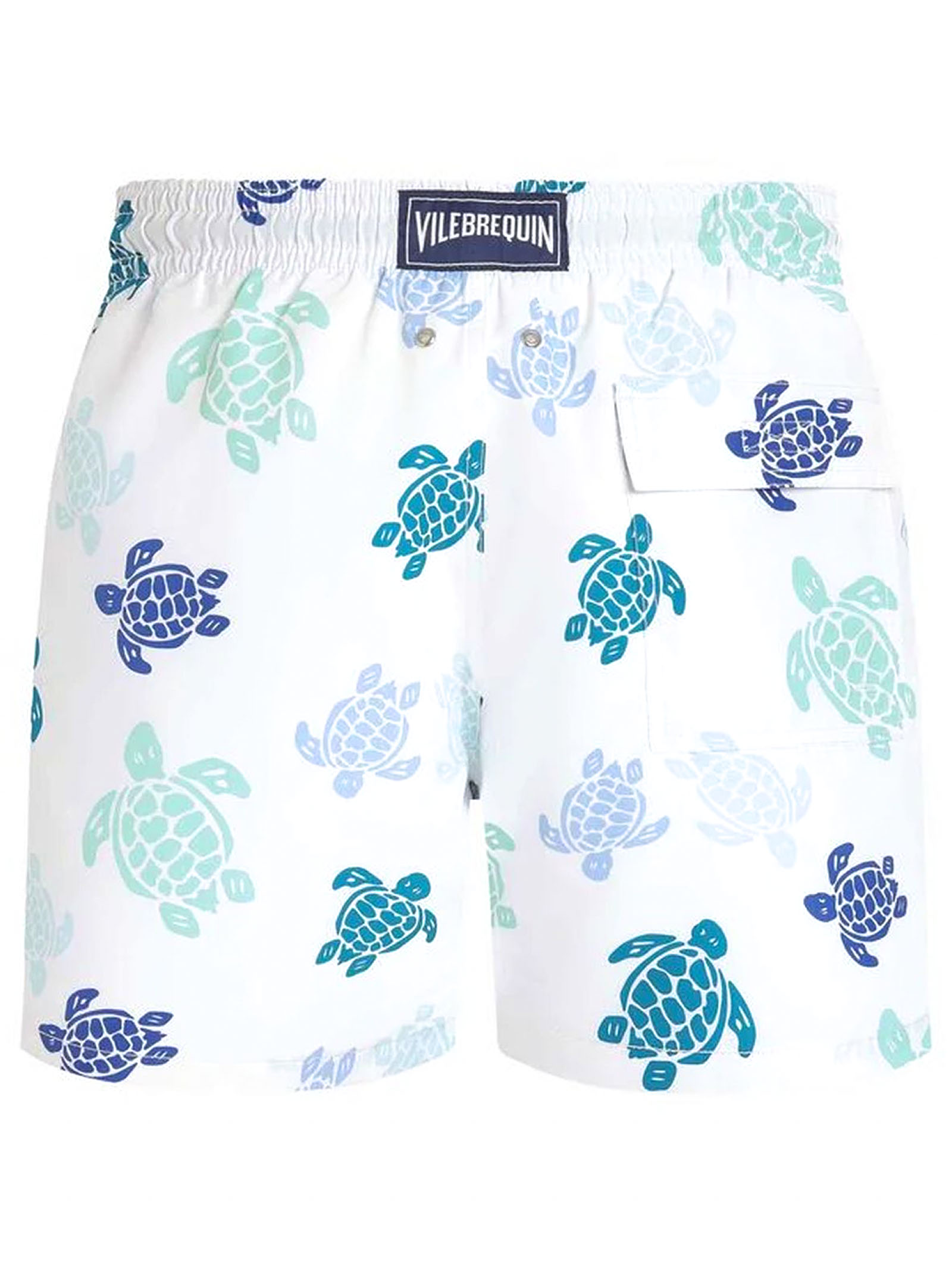 Costume da bagno con girovita elasticizzato dotato di coulisse con estremità in zamak e incisione Vilebrequin, Tasche laterali, Taschino posteriore cucito a mano per una perfetta continuità visiva con la stampa del costume da bagno, Due occhielli che consentono all'acqua di defluire per ridurre l'effetto "palloncino" quando si esce dall'acqua