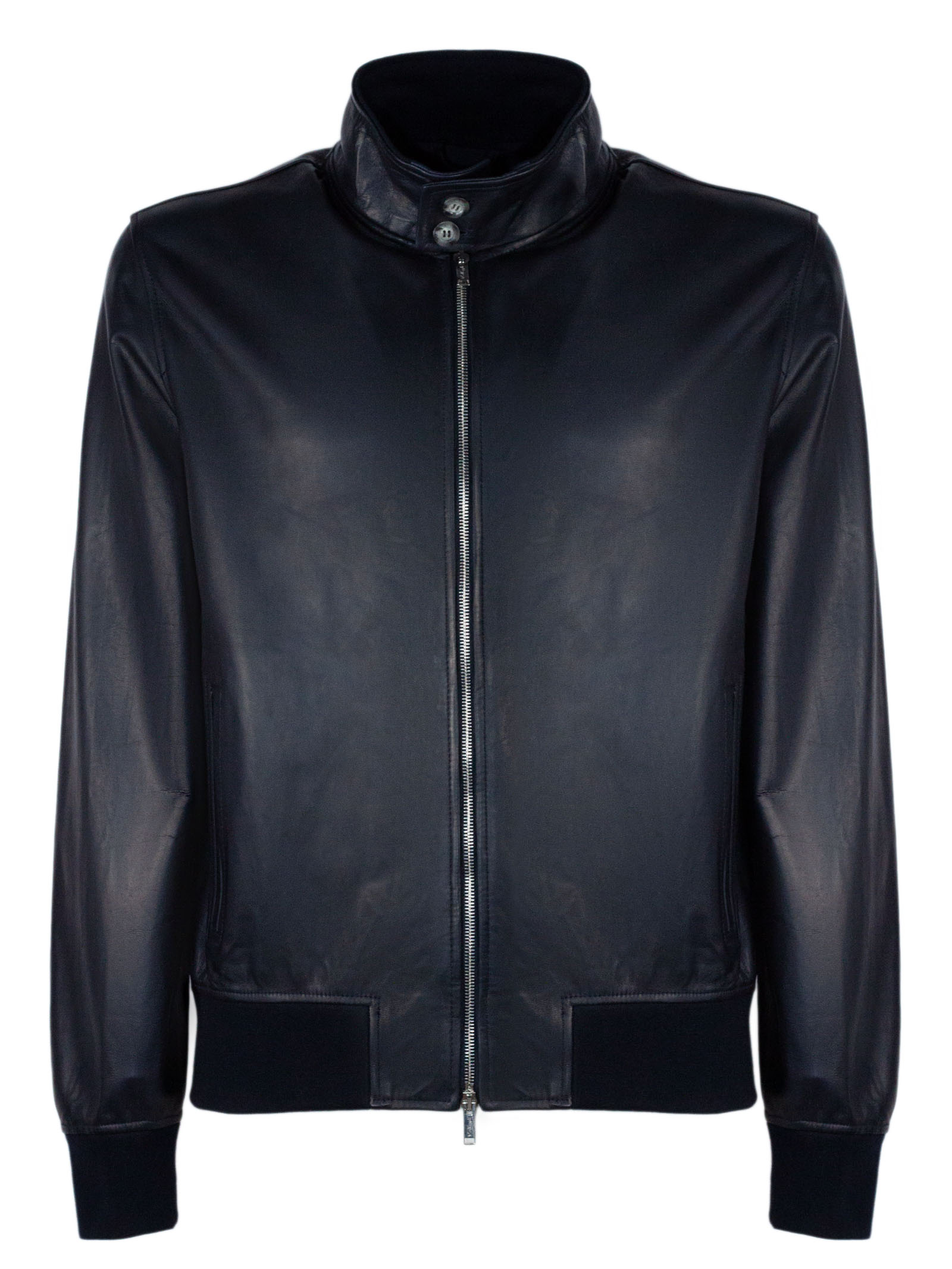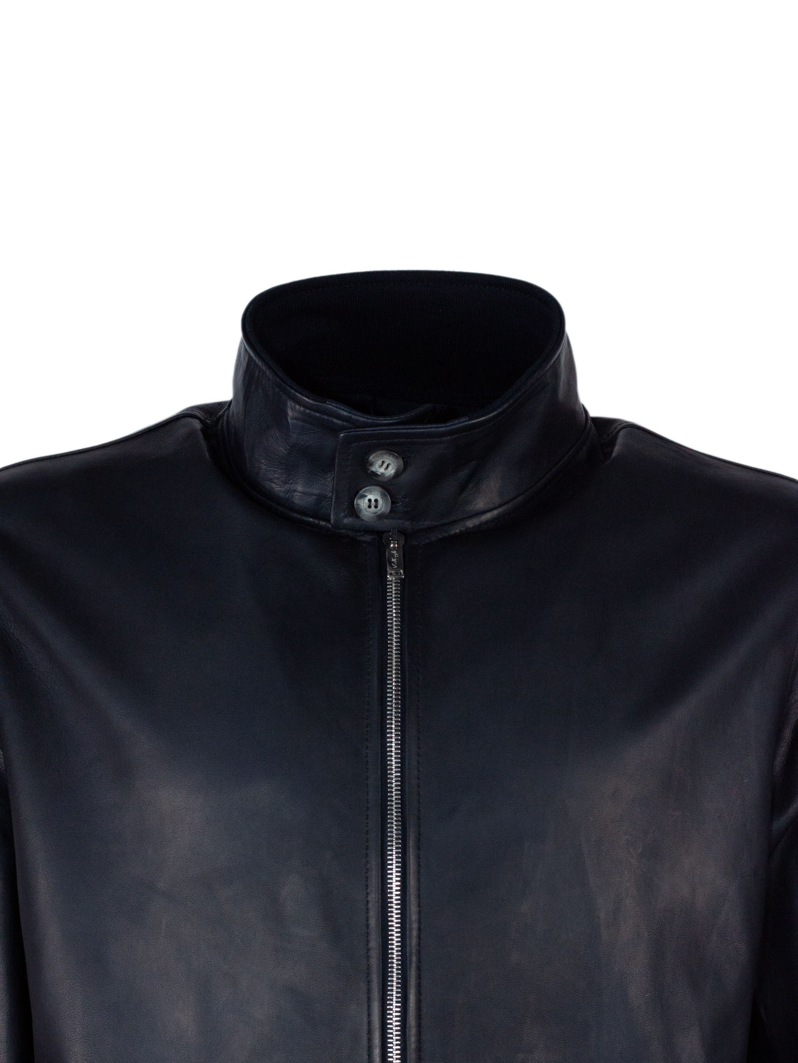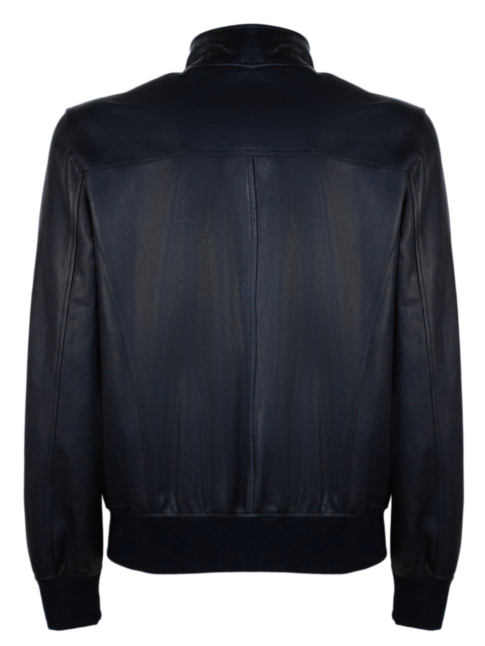 Bomber Fox in pelle di agnello blu scuro, tamponata a mano, interni in cotone, bordi a costina, tasche laterali a fessura con cerniere, bottoni al collo e zip a doppio cursore