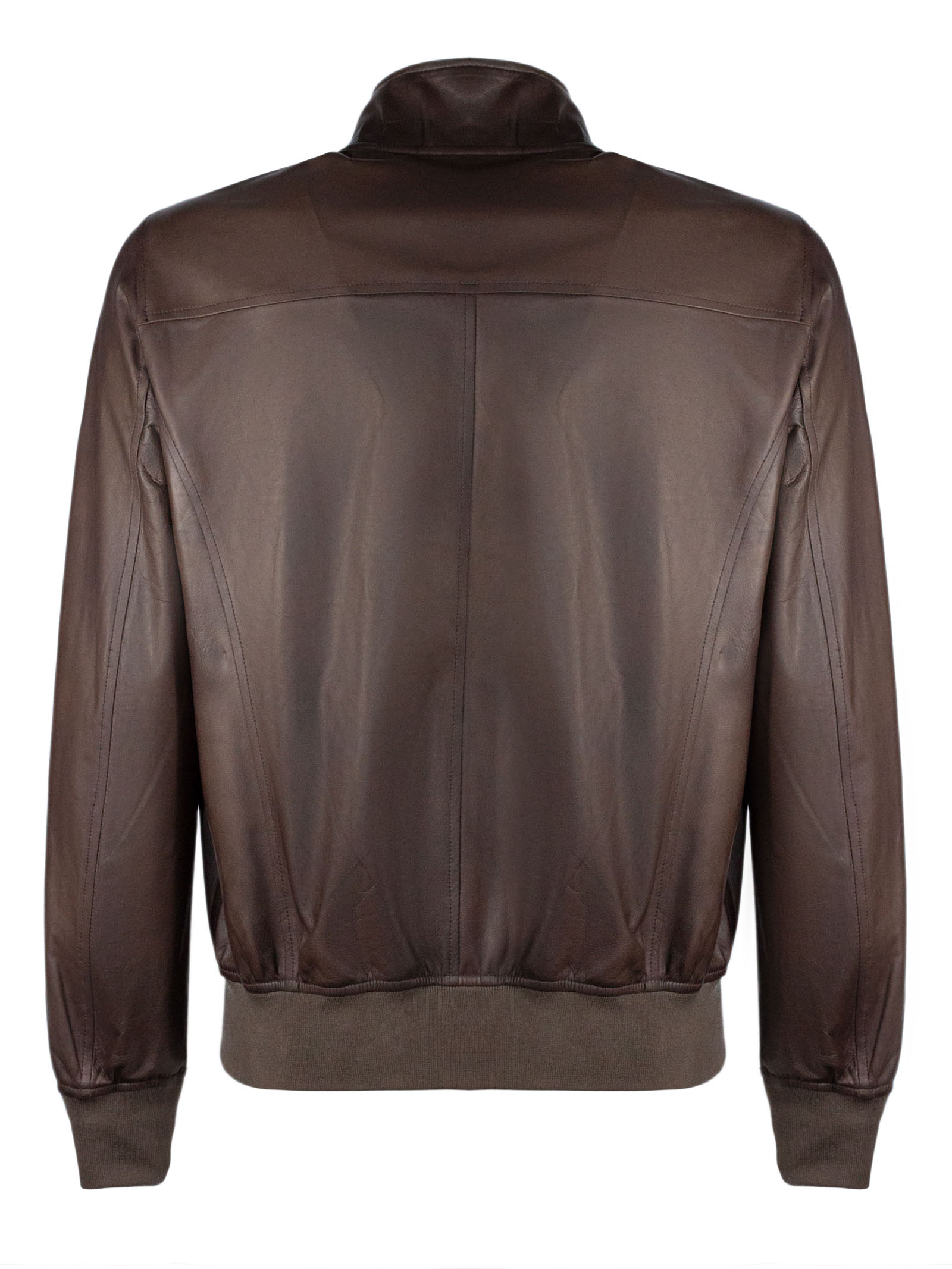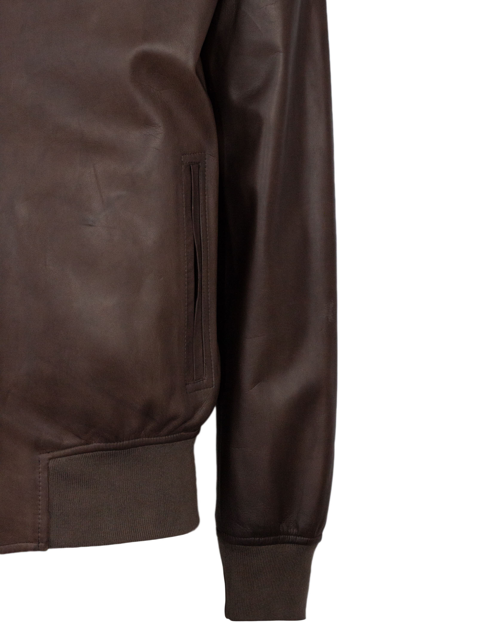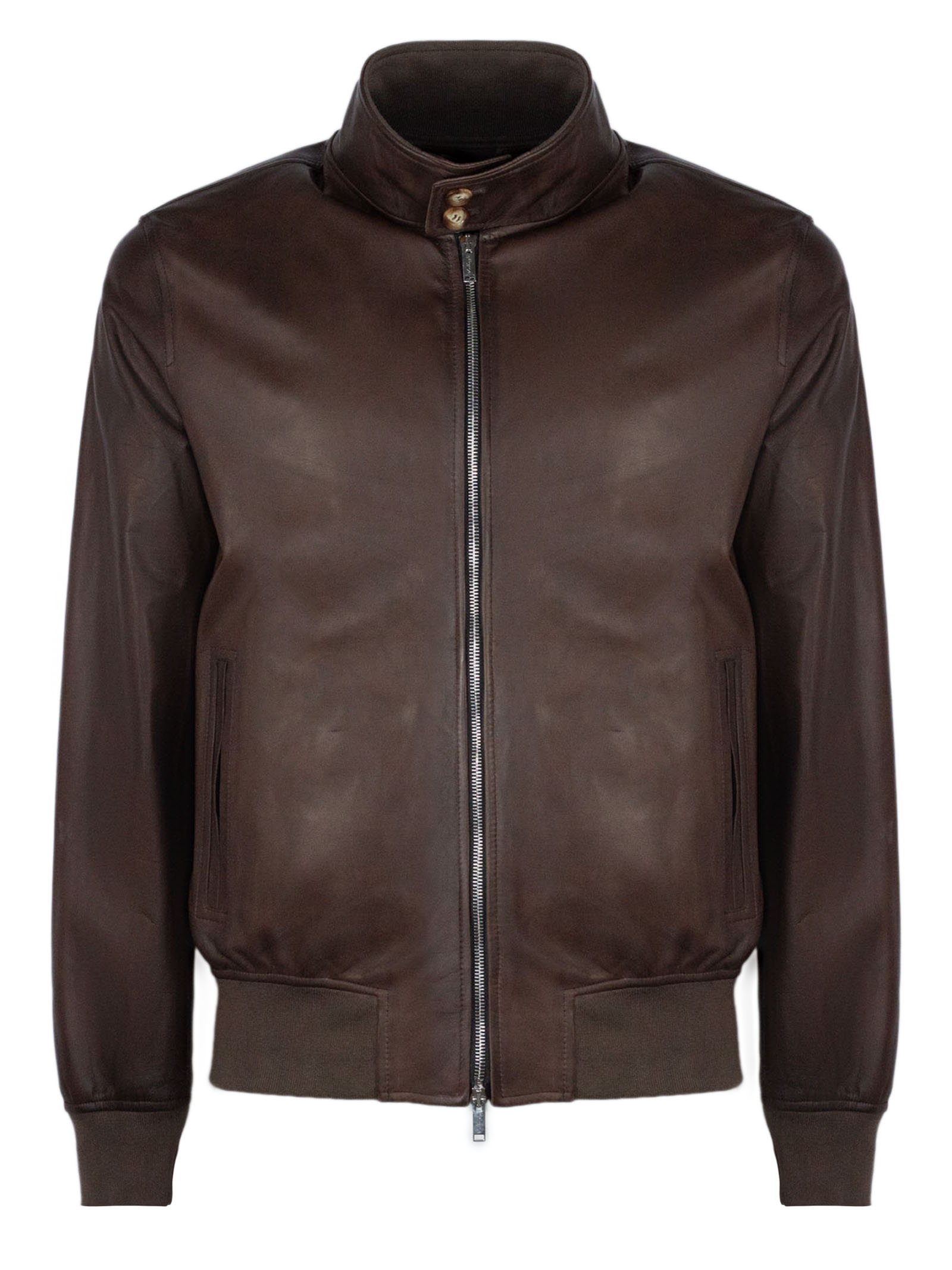 Bomber Fox in pelle di agnello marrone scuro, tamponata a mano, interni in cotone, bordi a costina, tasche laterali a fessura con cerniere, bottoni al collo e zip a doppio cursore