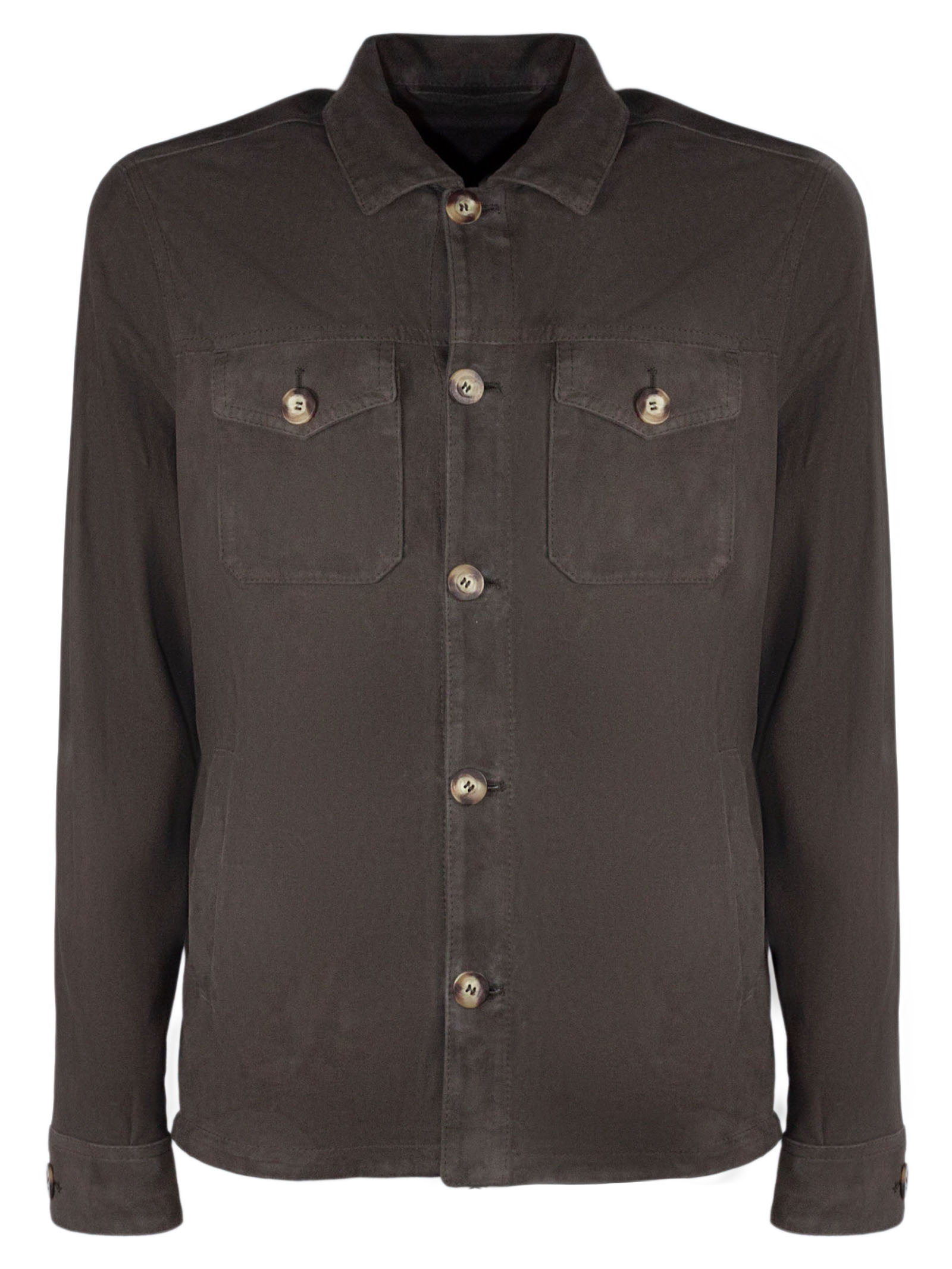 Giacca Urano in camoscio marrone con colletto classico, tasche frontali con bottone, chiusura frontale con bottoni, polsini con bottone