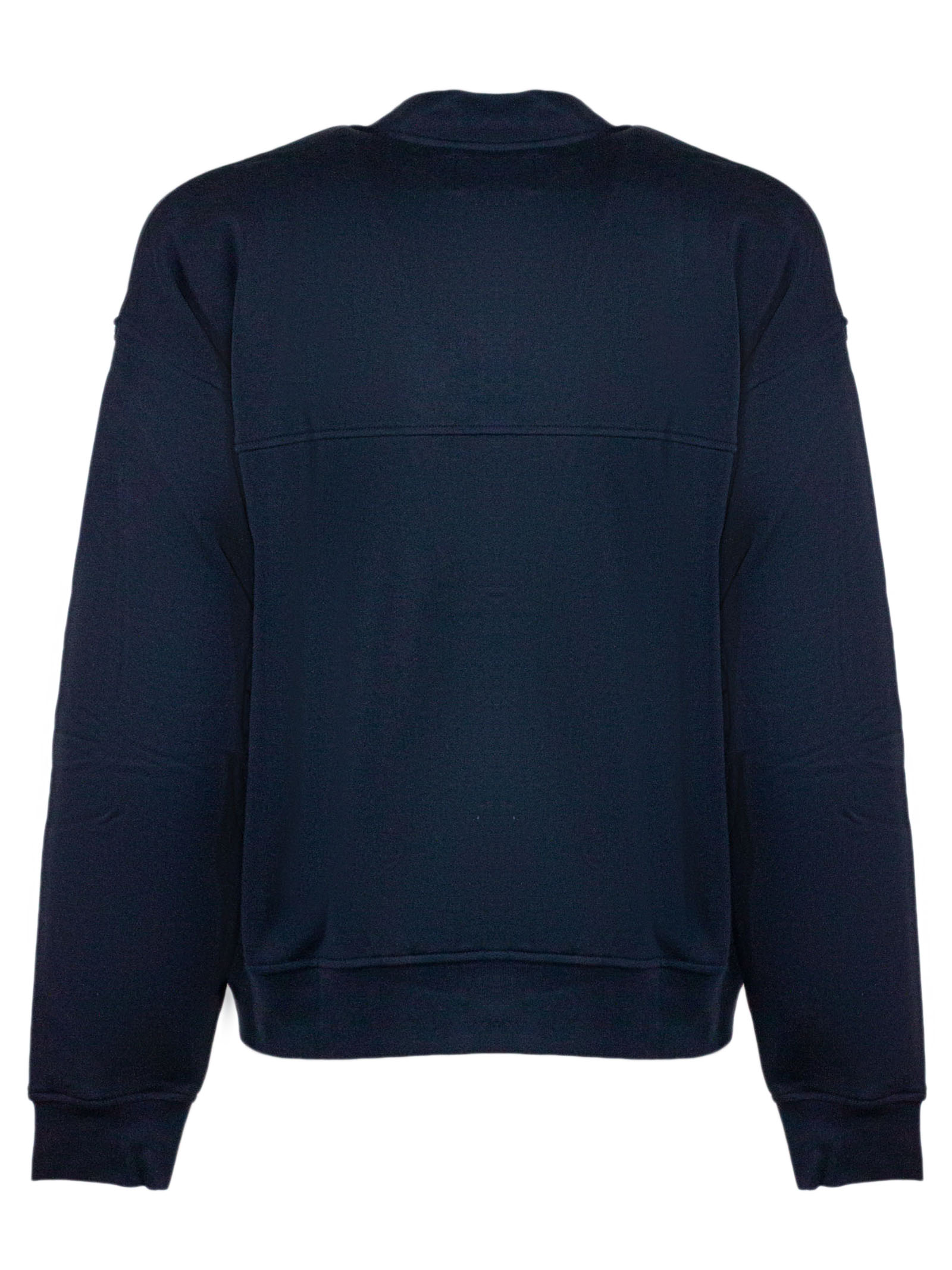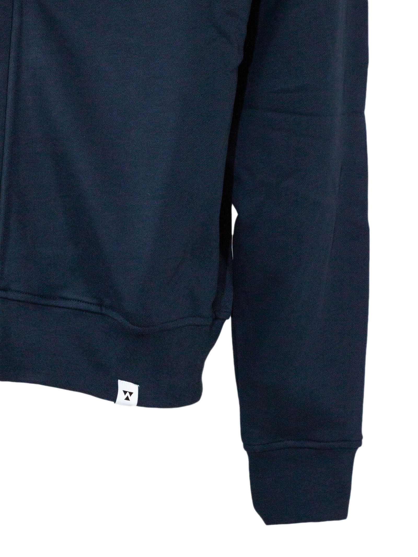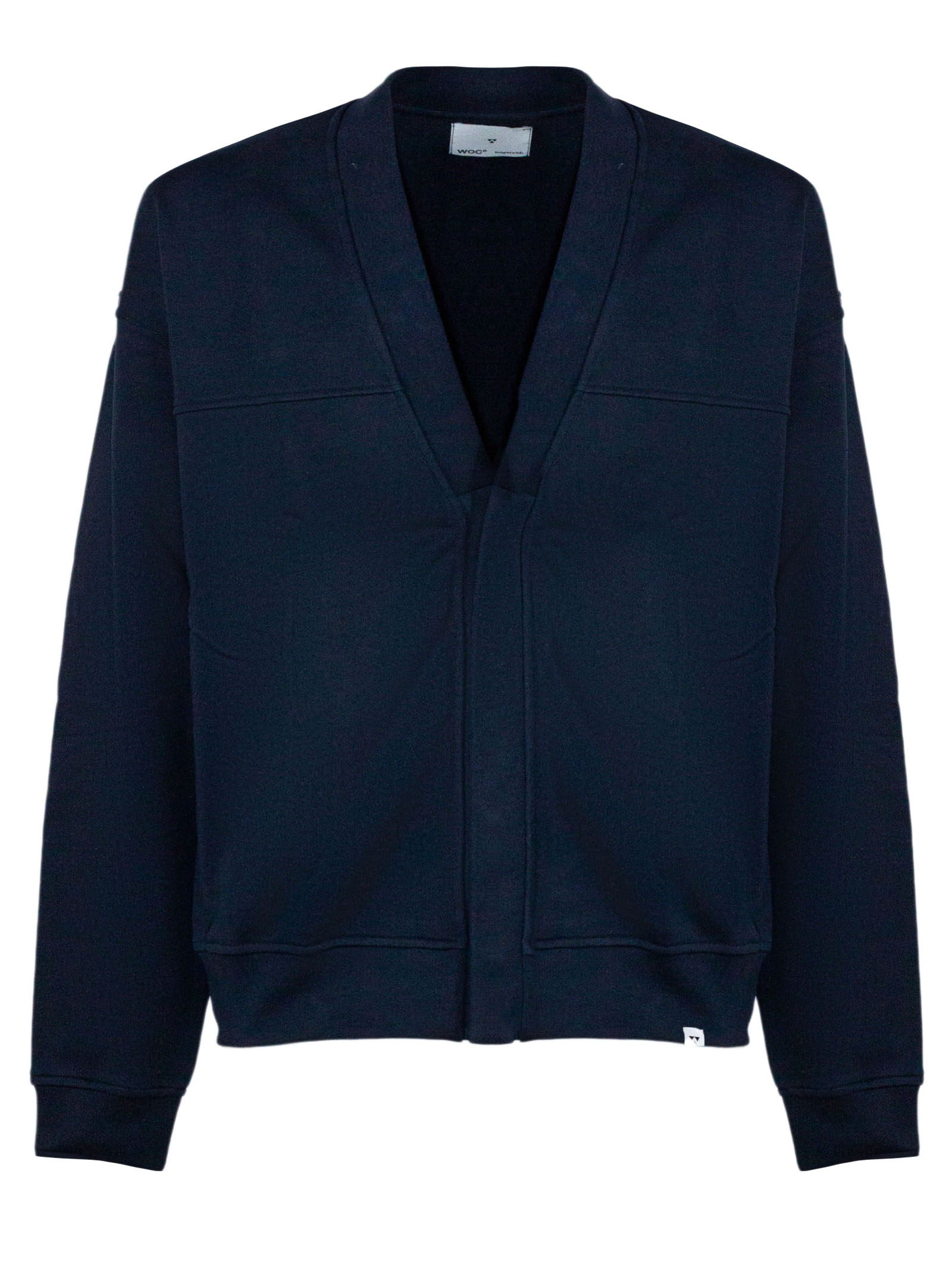 Cardigan in cotone blu scuro con chiusura frontale nascosta, scollo a V, finiture a coste, dettaglio logo