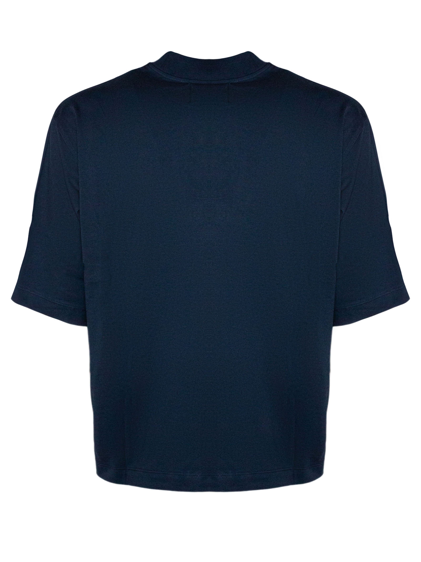 T-shirt in cotone blu scuro con mezzo collo, maniche corte, spalle basse, dettaglio etichetta logo, vestibilità ampia