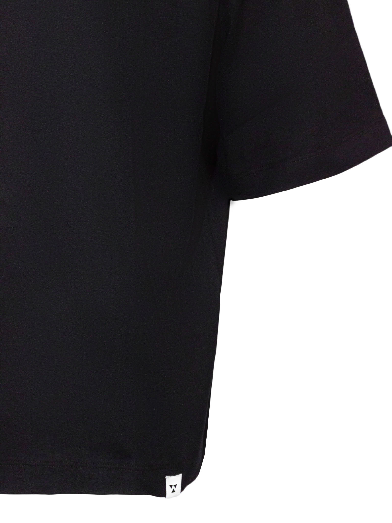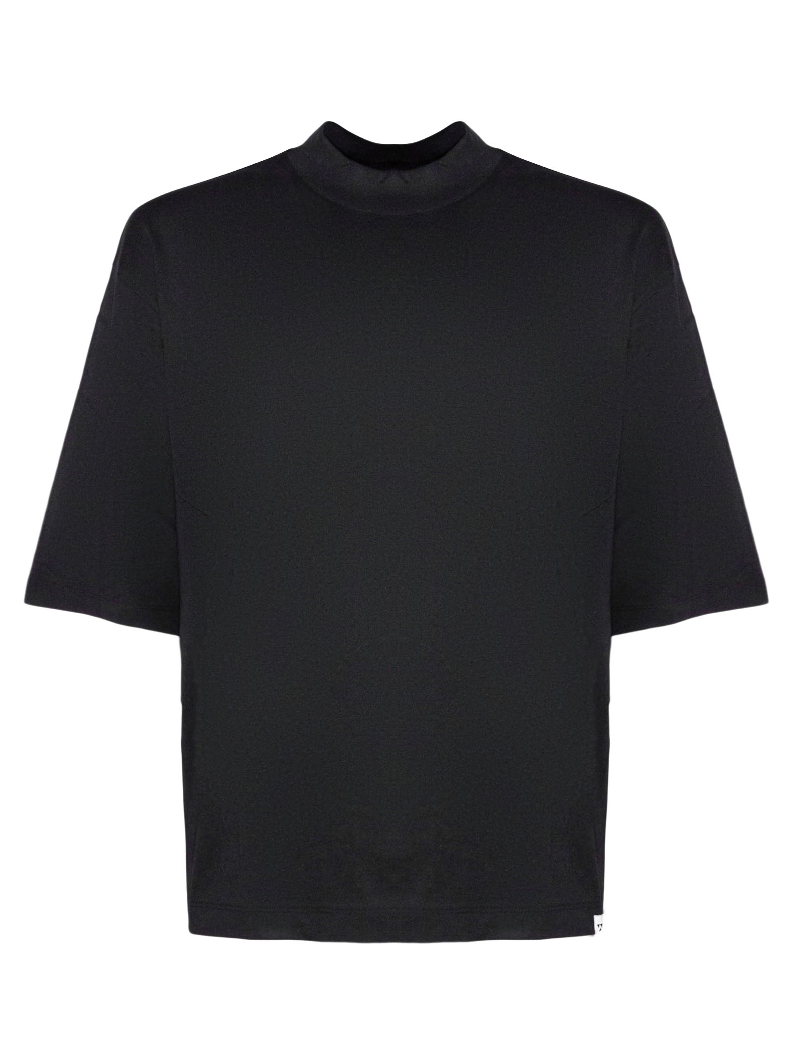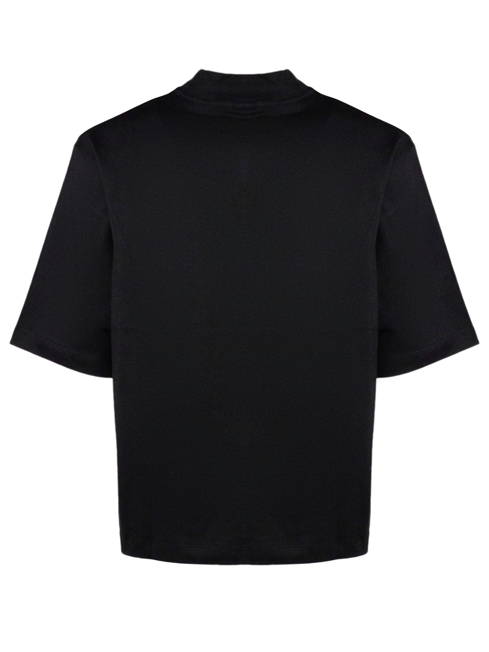 T-shirt in cotone nero con mezzo collo, maniche corte, spalle basse, dettaglio etichetta logo, vestibilità ampia