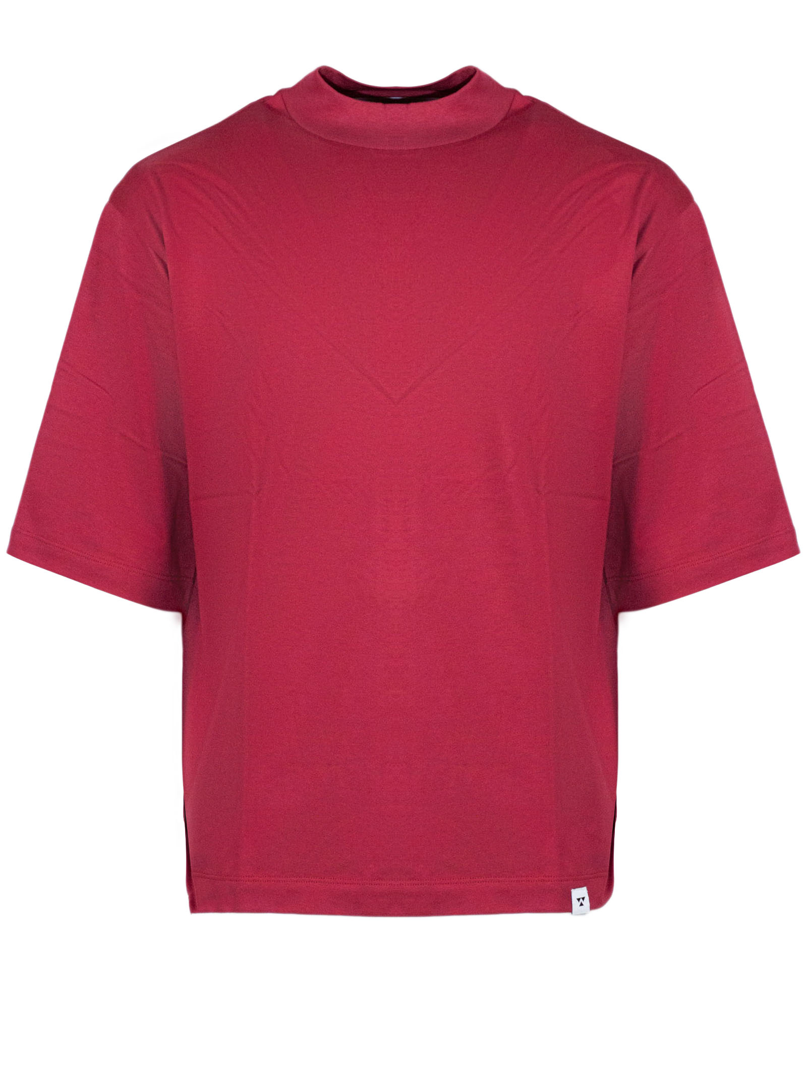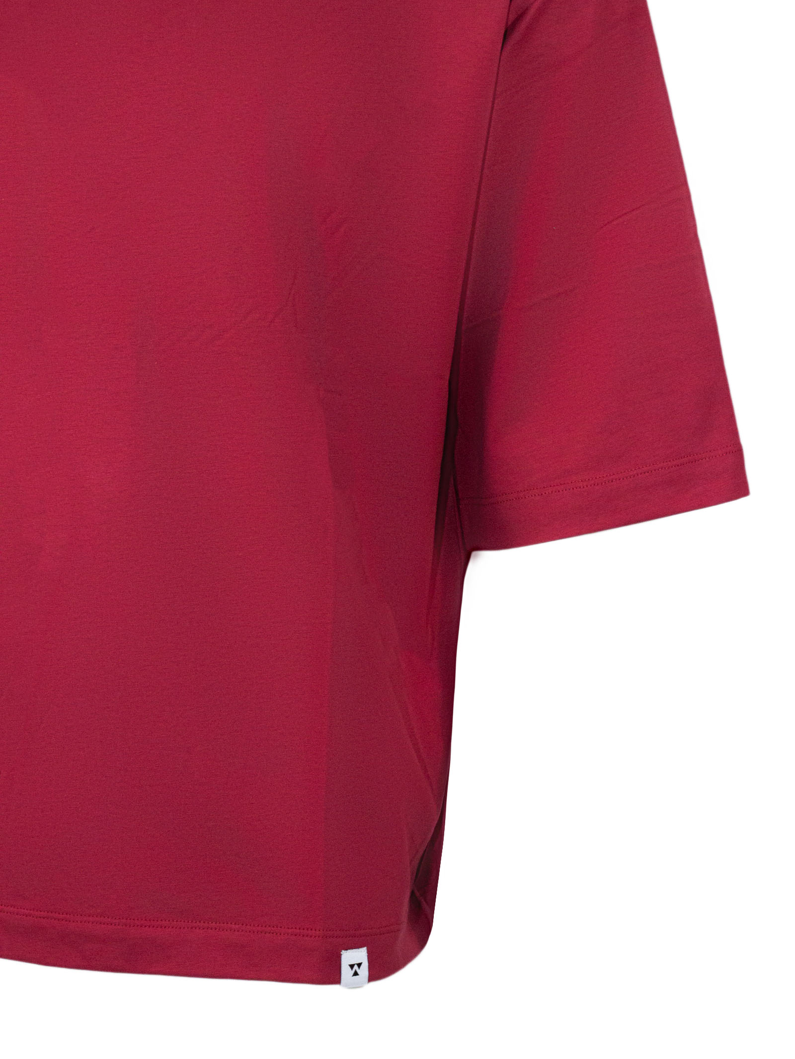 T-shirt in cotone rosso con mezzo collo, maniche corte, spalle basse, dettaglio etichetta logo, vestibilità ampia