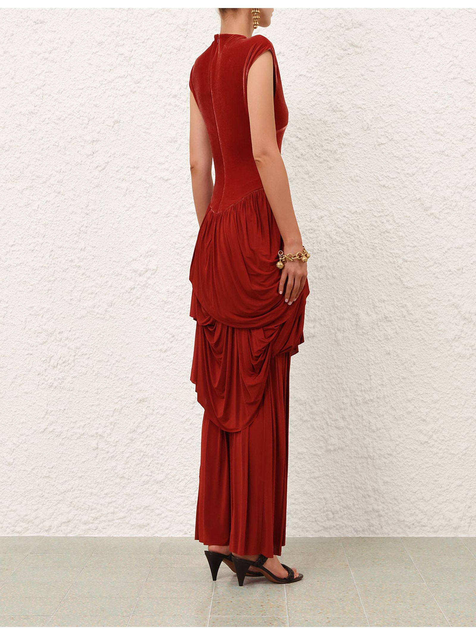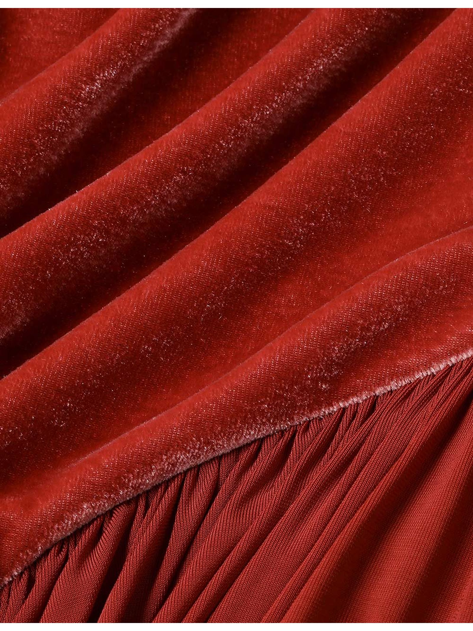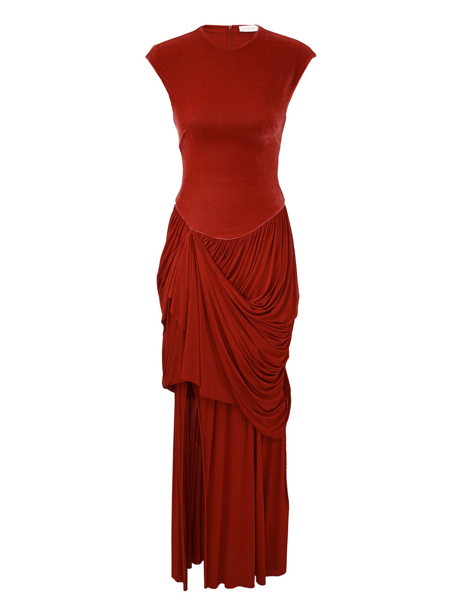 Abito con drappeggio Memento rosa scuro, Corpetto in velluto con cerniera invisibile al centro sul retro, Gonna dallarricciatura voluminosa con drappeggio