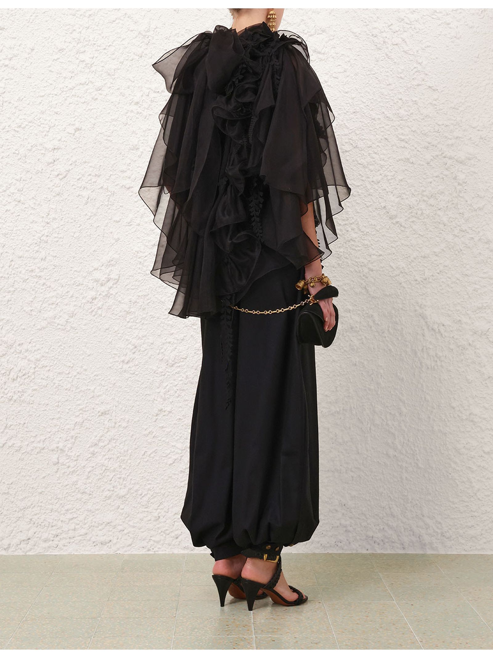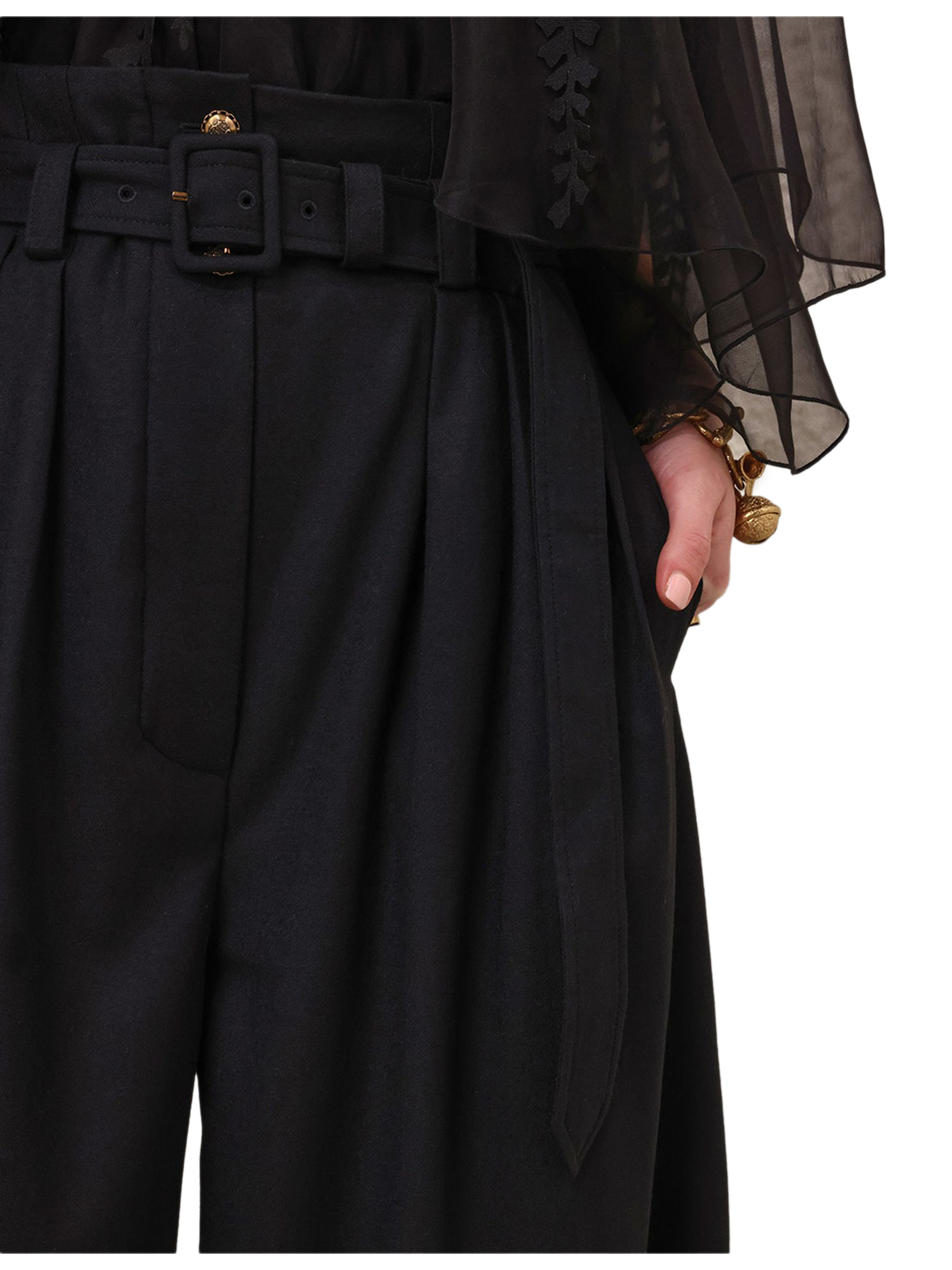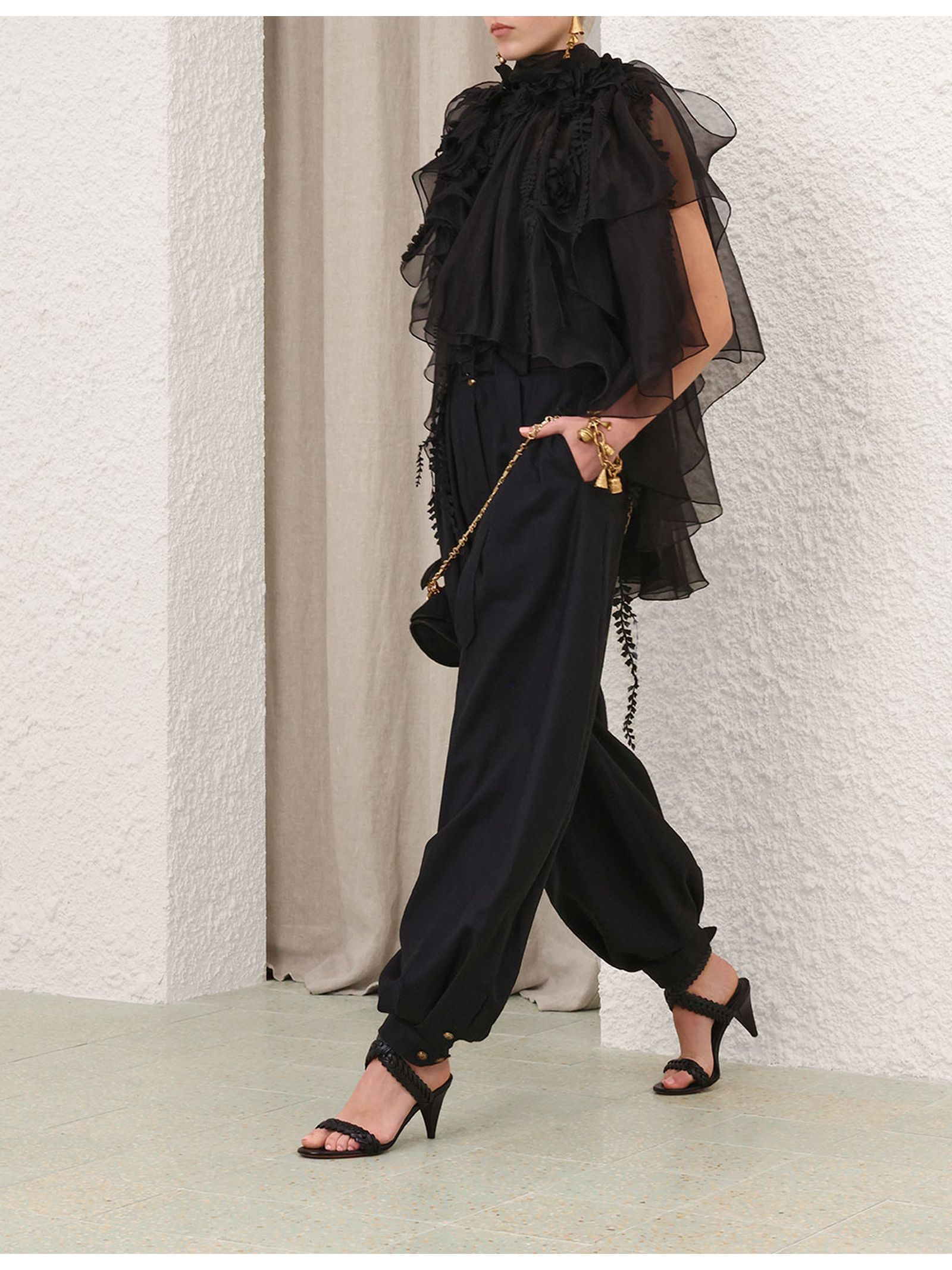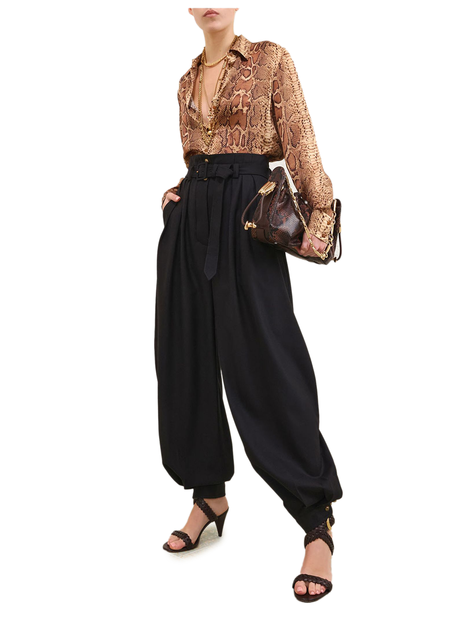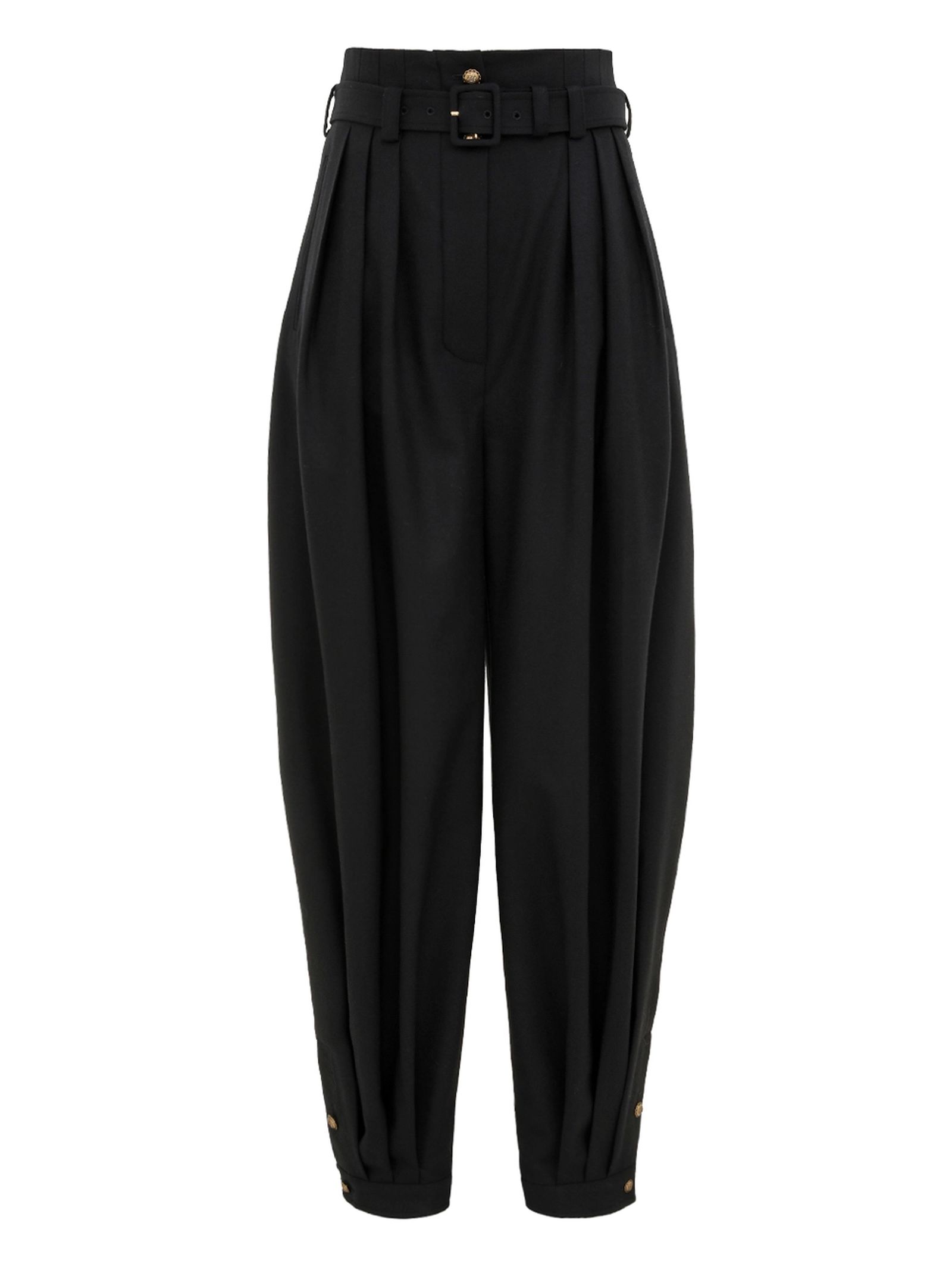 Pantaloni Harem In Lana Hypnotic In Nero, Tasche Laterali, Cintura Abbinata Rimovibile, Passanti Per Cintura In Vita, Linea Affusolata Sul Fondo, Cerniera Al Centro Sul Davanti E Chiusura Con Bottoni